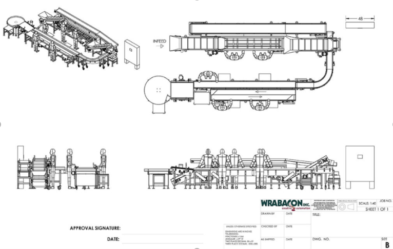 Wrabacon developed a custom design for the client. The system will be produced in phases, with phase one to include the conveyors from the existing (right hand) filler to the existing spot pack machine. Phase two will include the conveyors from the new (left hand) filler to the new spot pack machine as well as a product elevator and conveyors to feed spot packs to the recently purchased palletizing line. Also included in phase one will be the addition of a new labeling conveyor prior to the inclined conveyor on the recently purchased palletizing line.